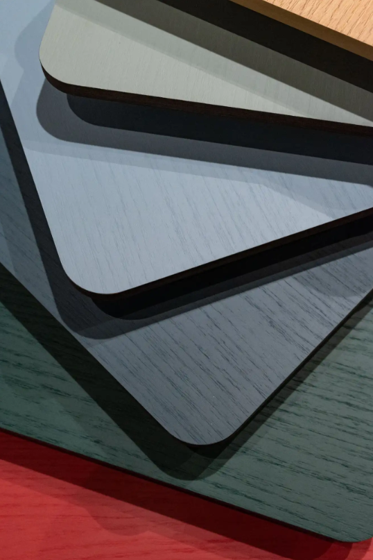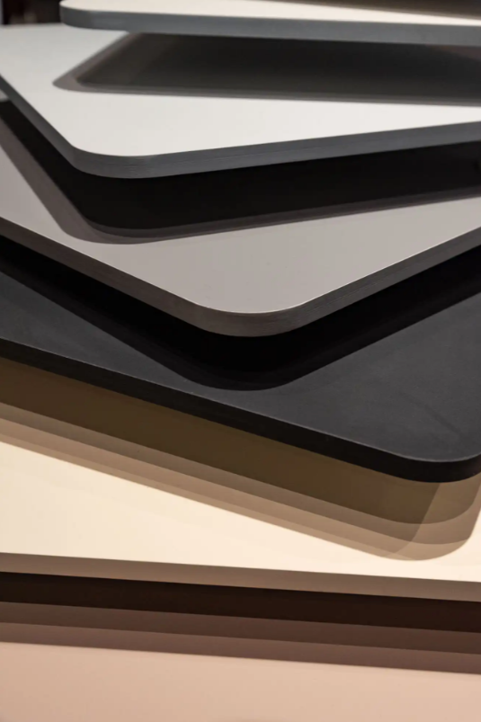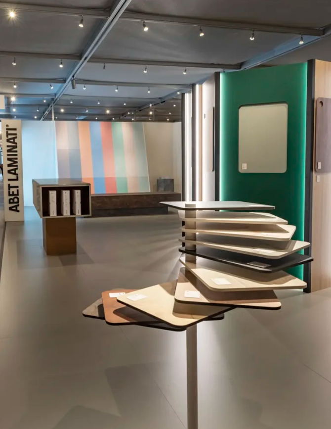 Parmi les produits les plus remarqués, les stratifiés Re-Abet, réalisés avec un noyau en papier kraft 100 % recyclé post-consommation, incarnent pleinement l’engagement environnemental de l’entreprise.